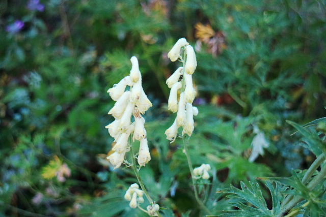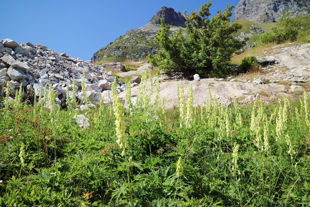 | ピックデュミディの岩壁に咲いていた花。キンポウゲ科のものらしいが・・・(M) | ガヴァルニーの白いトリカブト。(M) | ||