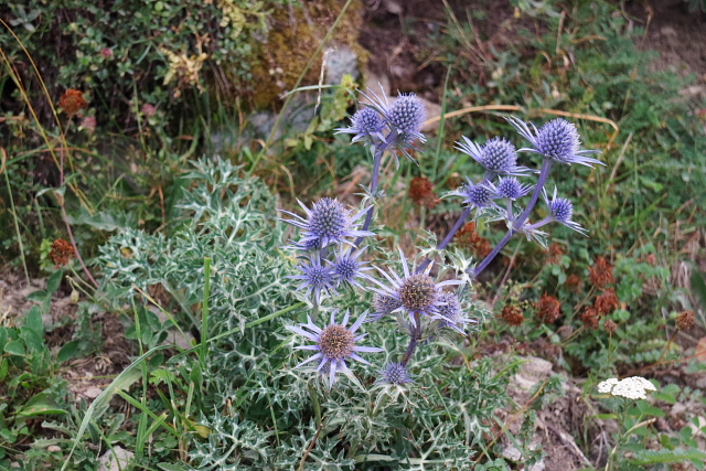 | ゴーブ湖。フウロソウの仲間?(M) | 現地ではシャルドンブルーと呼ばれるアザミの一種。(S) | ||
