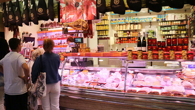 | 岬からの俯瞰。ワイキキか江ノ島か。(M) | 市場の肉屋さん。生ハムがメイン。(M) | ||