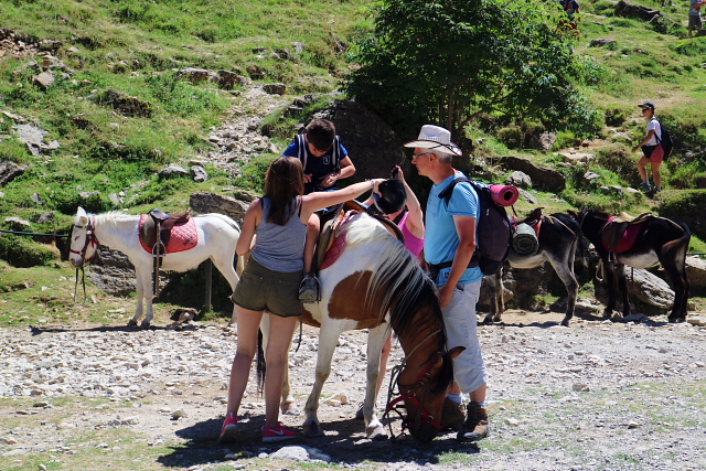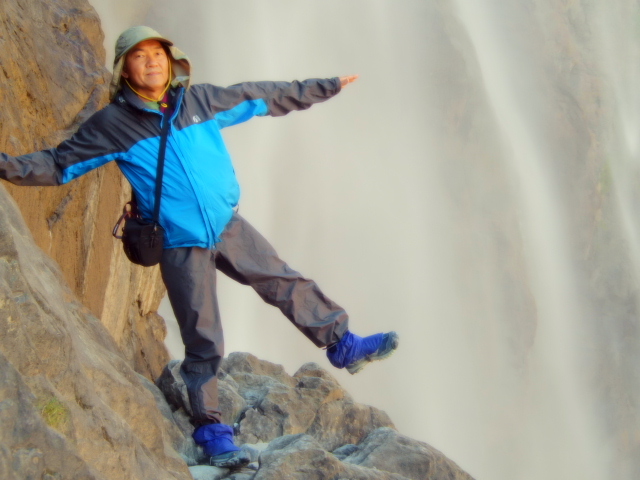 | 馬やロバで登山する人も多い。。(S) | 滝に備えて雨具を着込んでいる。(S) | ||